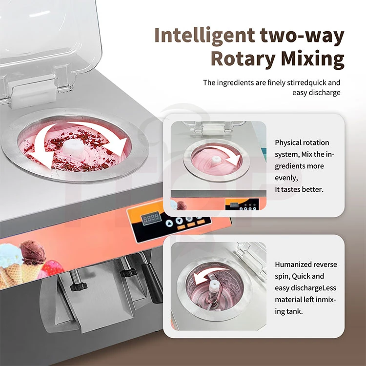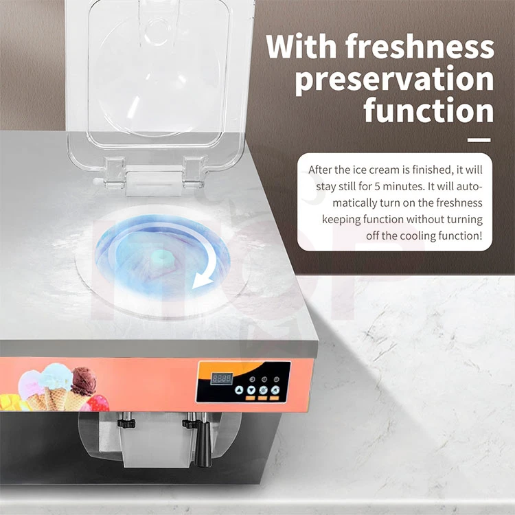 This machine adopts a transparent lid, which makes it easy to understand the state of the ice cream. After the ice cream ismade,the automatic preservation can make the ice cream in the best condition to be displayed to many ice cream enthusiasts and buyers. After the ice cream is made according to the expected time, no other operations are required. This function can be activated every 5 minutes, and the running time is 3 minutes. Attention: Clicking the power button after the ice cream is made will end the machine's operation and will not activate the automatic preservation function.