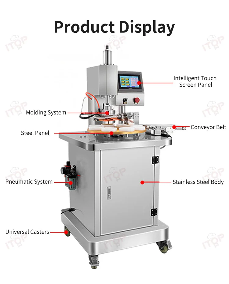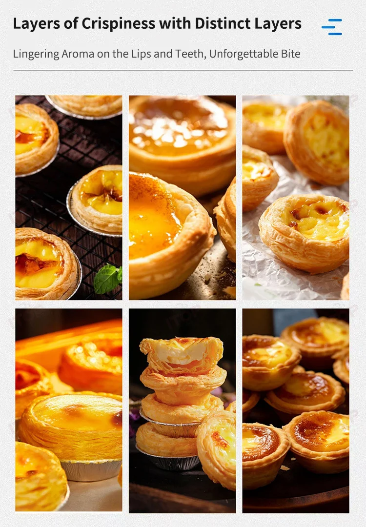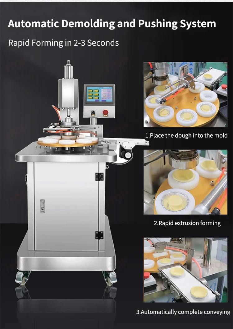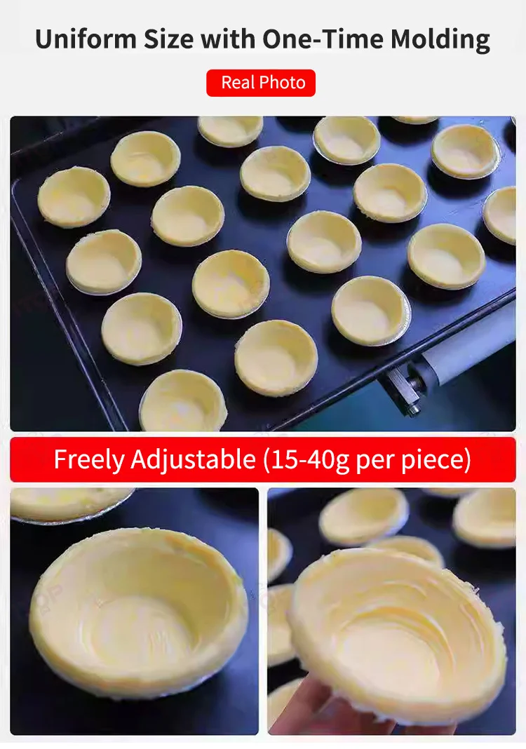 Product Features: The shell is made of stainless steel, controlled by imported PLC, formed by air pressure, with a mechanical rotary disc structure, a fully stainless steel shell, embossed mold base, and can be equipped with different molds to produce various types of egg tarts such as Guangdong-style egg tarts, grape tarts, and butter tarts!