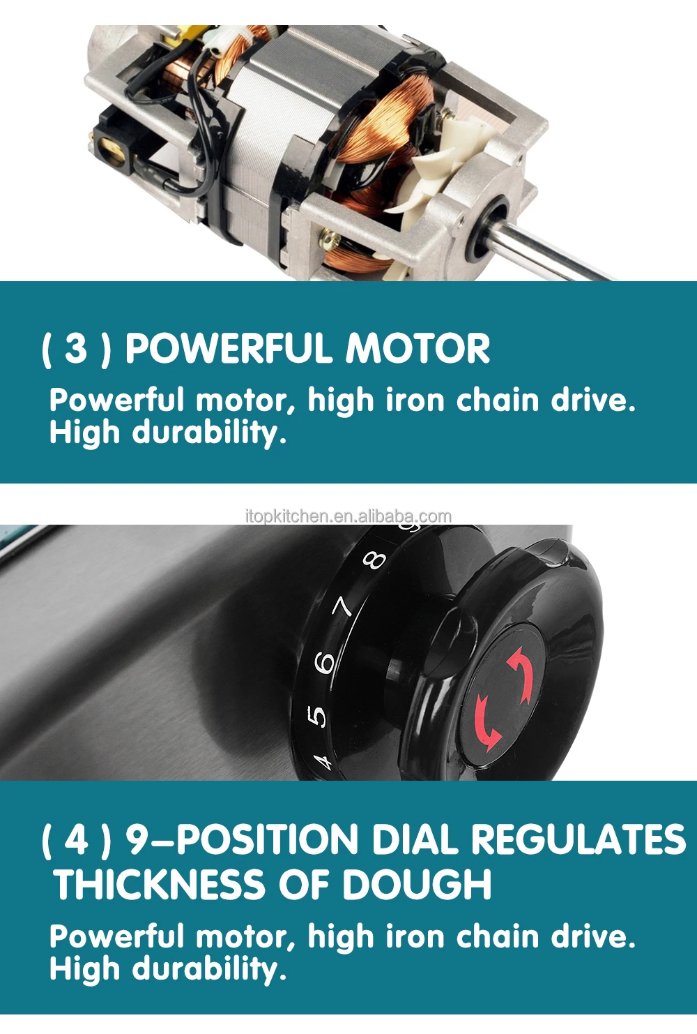 4. 9-position dial regulates thickness of dough.Thickness between 0.5mm-5mm