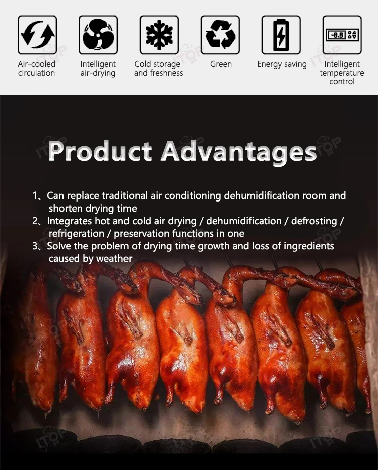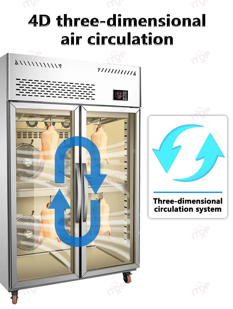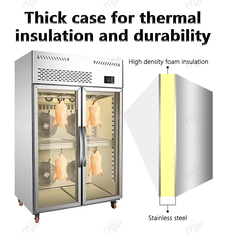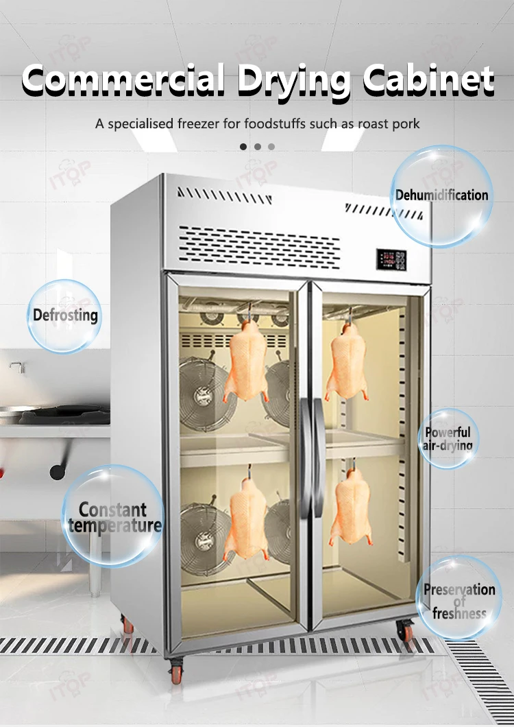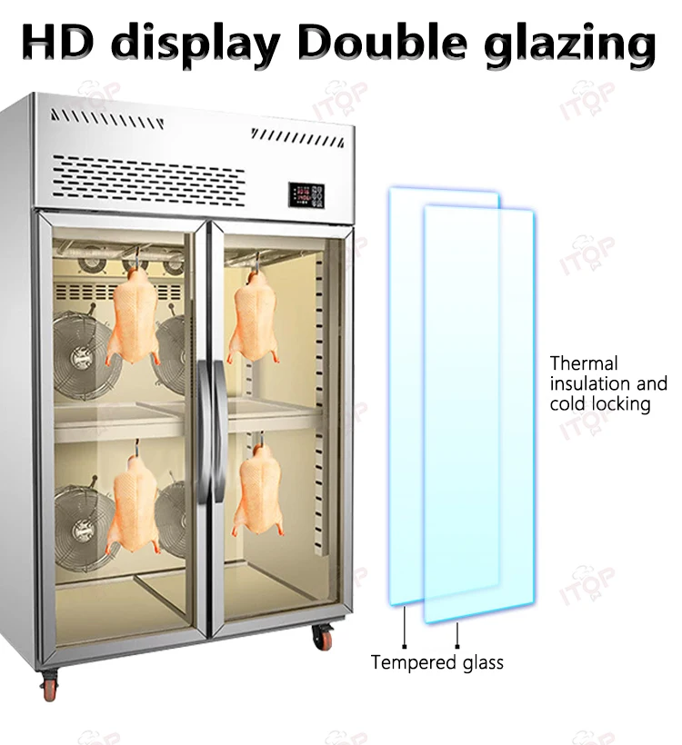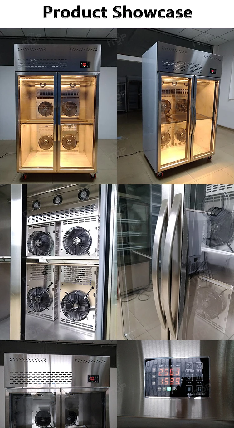 1.Good German technology,brand compressors 2.High speed fan with high air volume for air drying 3.360° circulating air-cooled drying without dead ends 4.Exclusive intelligent panel for easy operation 5.Food grade stainless steel for good safety and hygiene 6.Double-layer insulating glass with internal locking and external insulation 7.High density foam insulation to save electricity 8.Full copper condenser for rapid heat dissipation 9.Three horizontal bars hanging practical large capacity