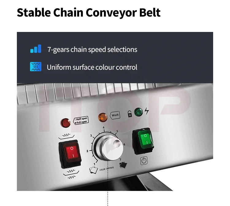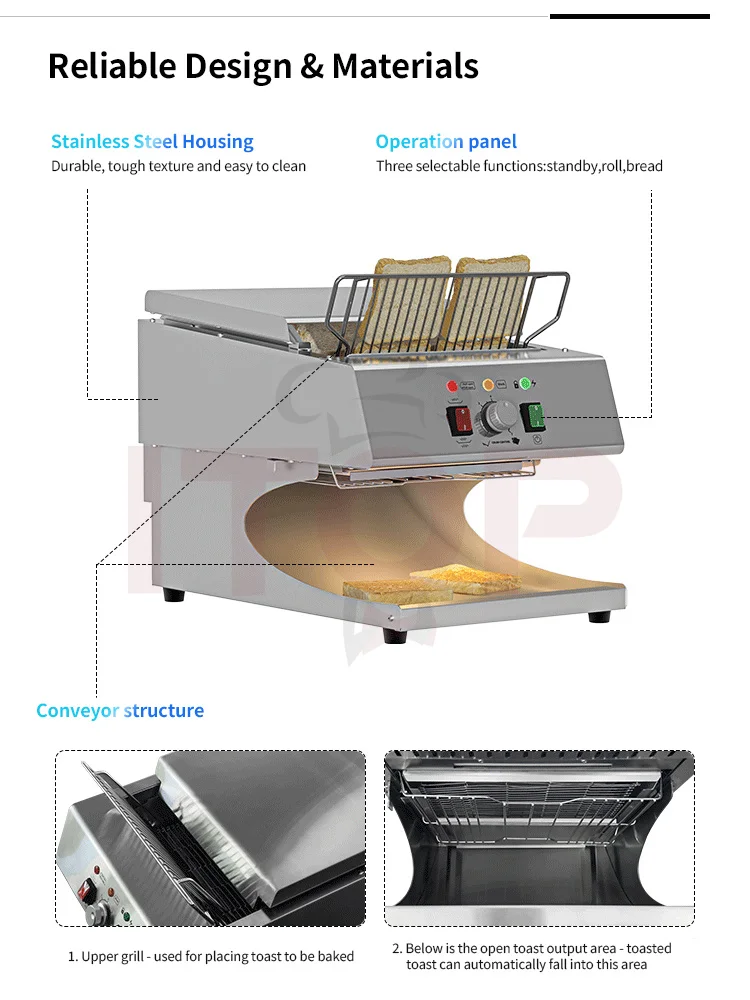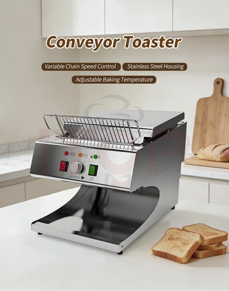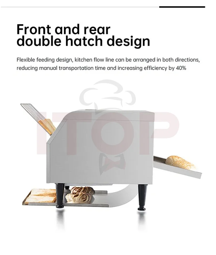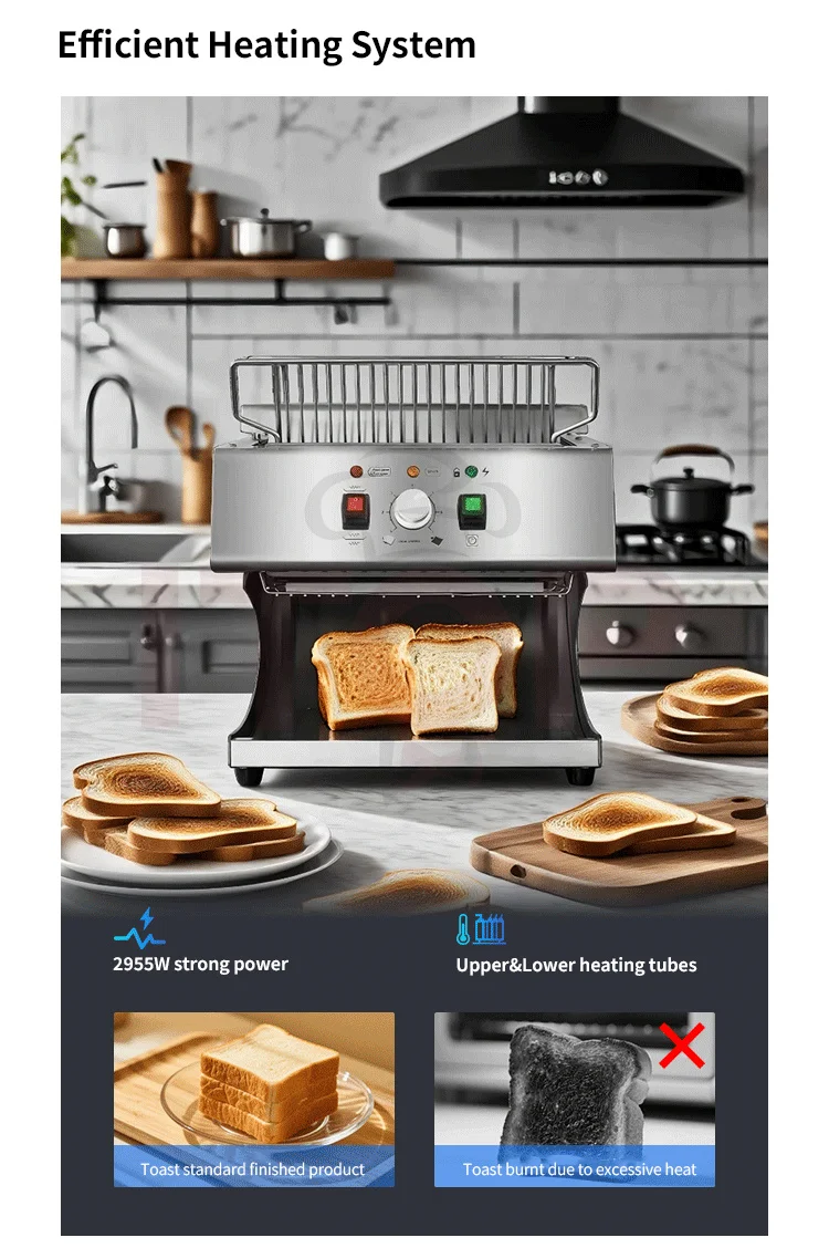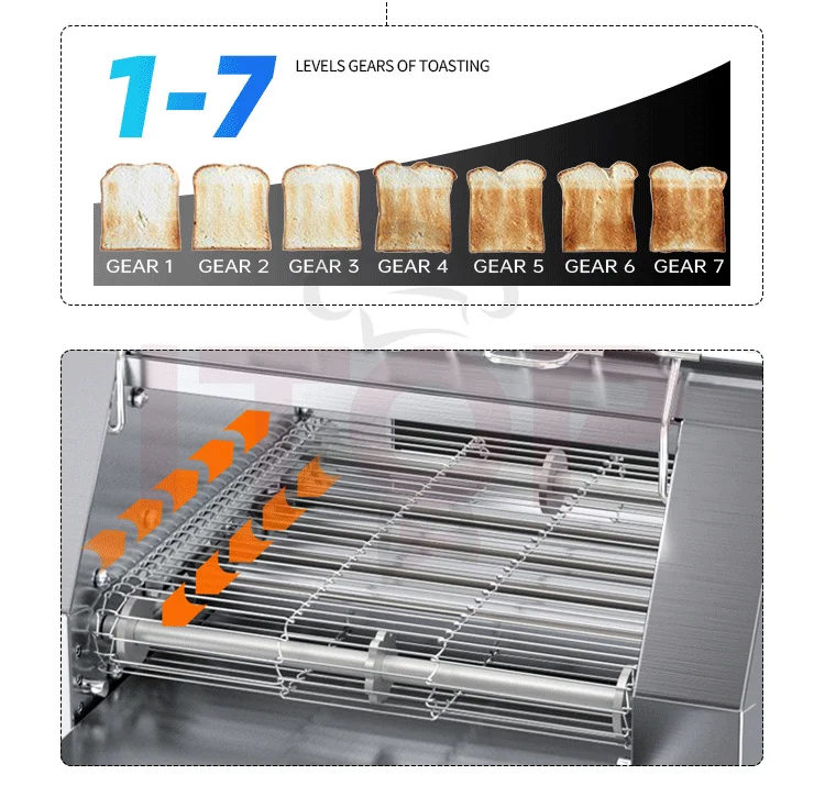 1.Capable of toasting bread slices up to 30mm thick, compatible with a wider range of bread varieties. 2.Built-in intelligent energy-saving system for reduced power consumption. 3.Adjustable speed control for precise toasting time setting (equipped with an electronic lock function). 4."Cool-touch" housing design to prevent high-temperature scalds. 5.Flip-top structure for easy internal cleaning. 6.LED light illuminates the toast outlet area for convenient visibility. 7.Removable crumb tray for hassle-free cleaning. 8.Modern brushed stainless steel housing for an attractive and durable finish. 9.Open-style slide outlet for clear visibility of toasting progress at a glance. 10.Uniform and appealing toasting results, delivering professional-grade quality! 11.7 adjustable settings with distinct chain speeds and temperature controls to meet diverse customer needs.