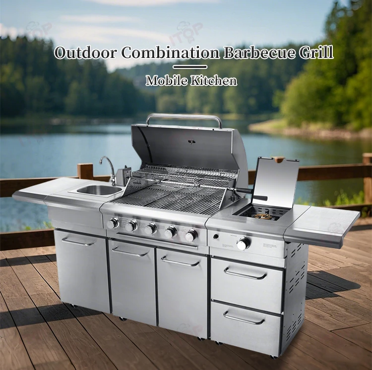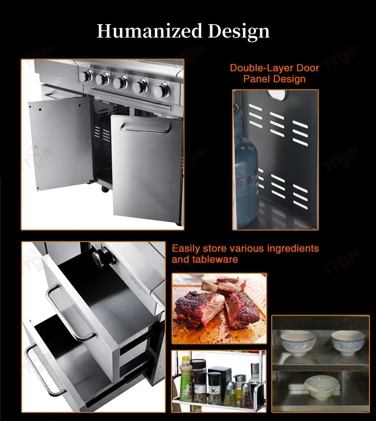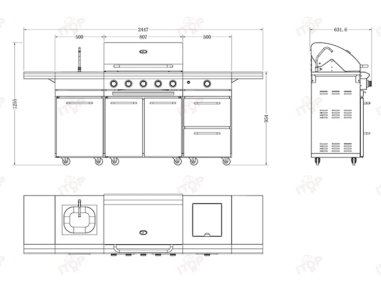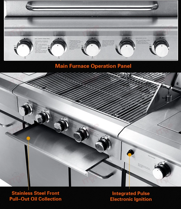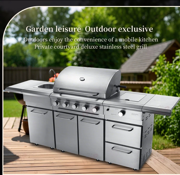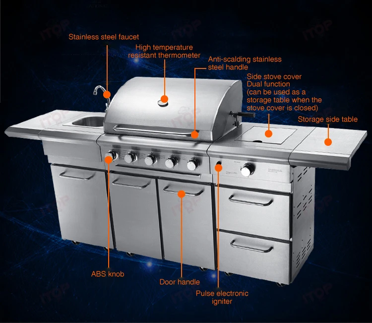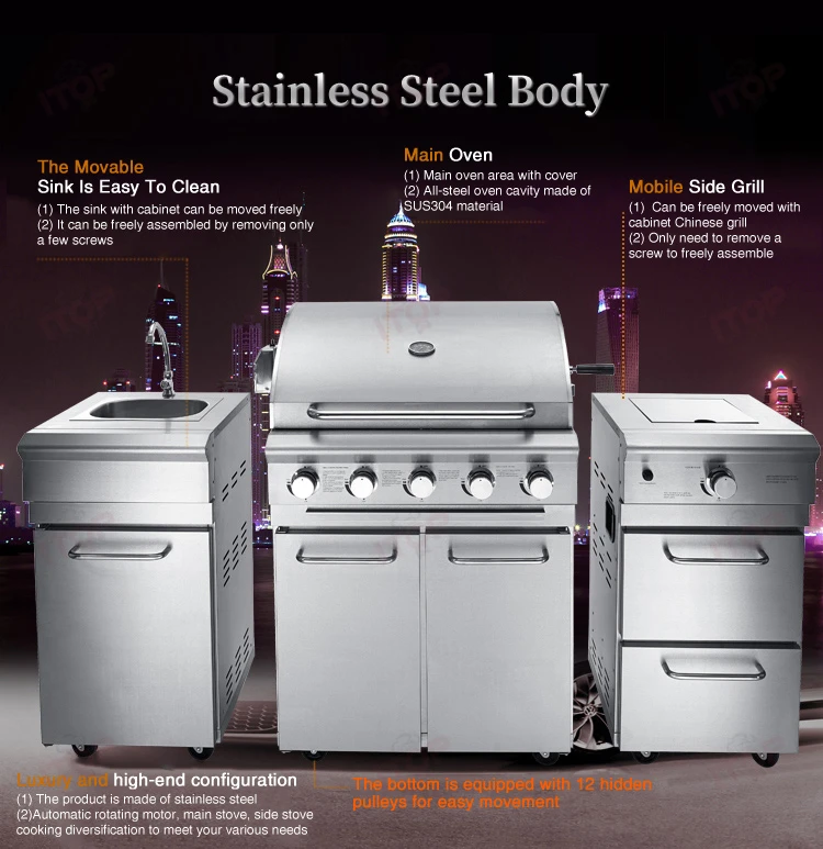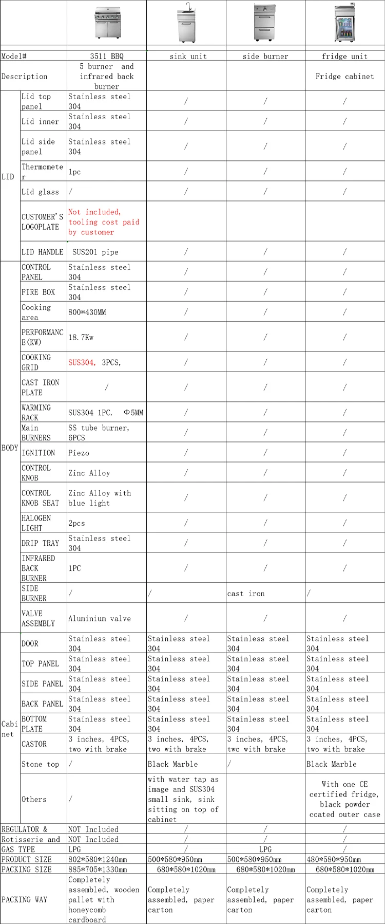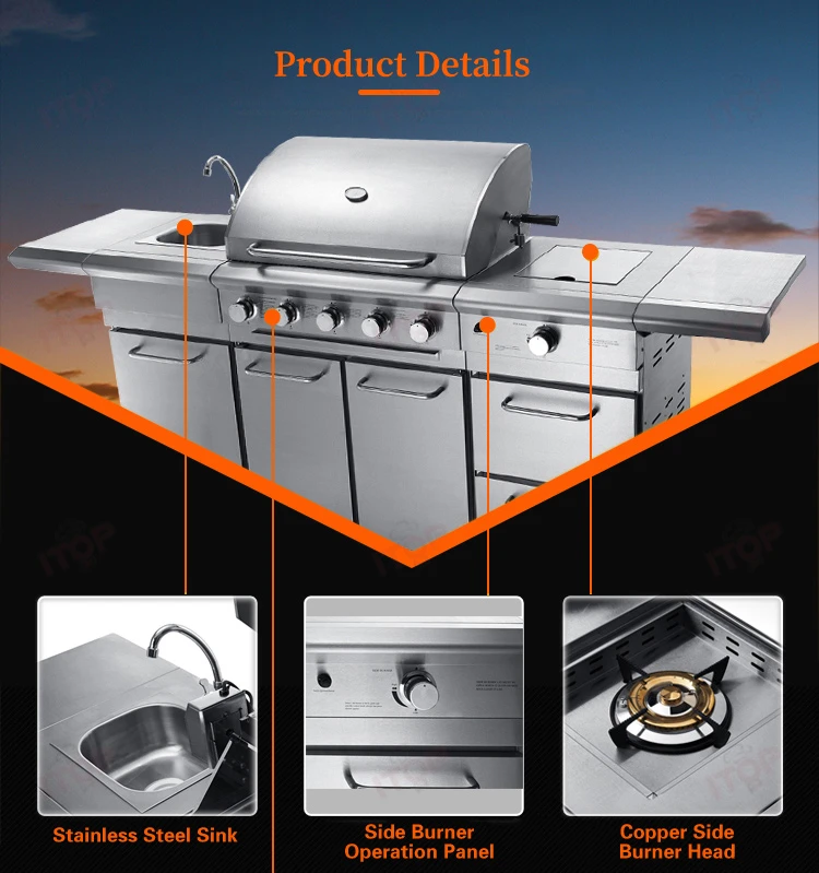 Standard: 5 burner gas grill + sink cabinet with faucet + gas side buner cabinet