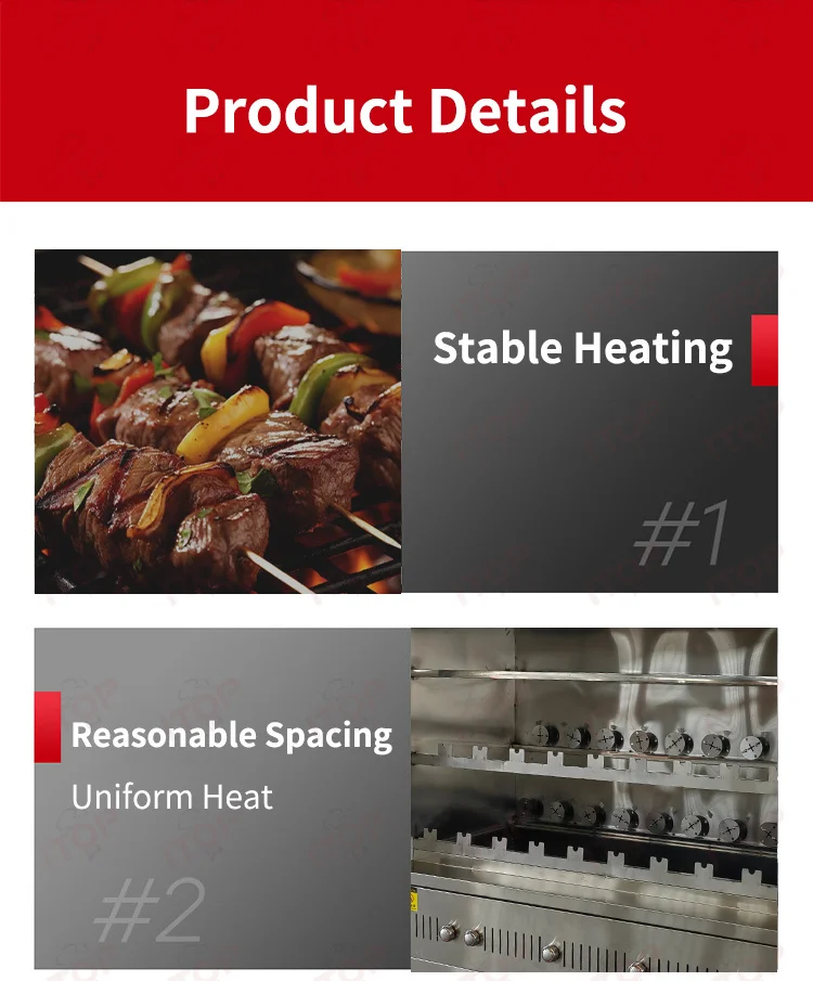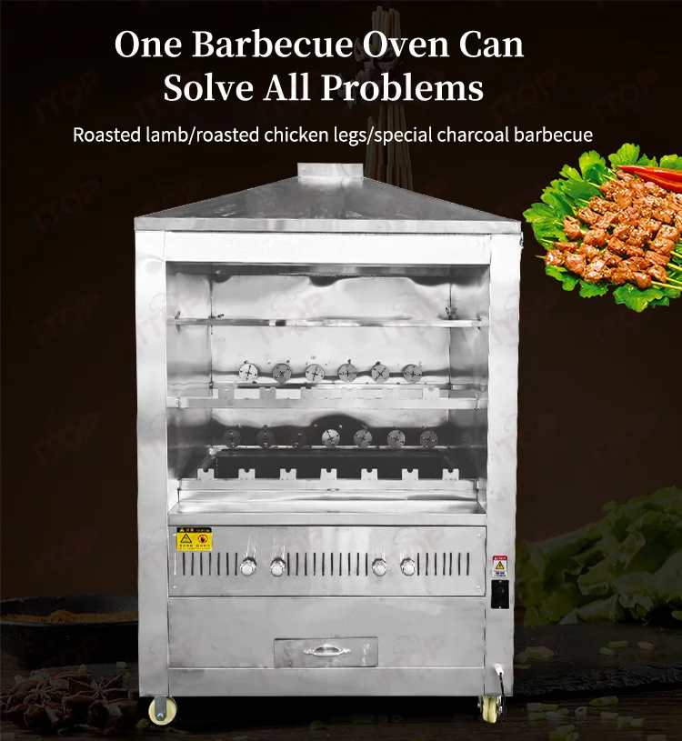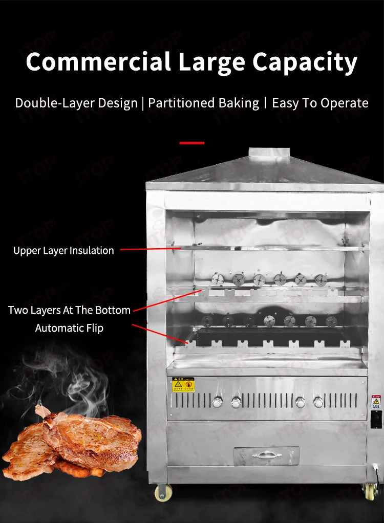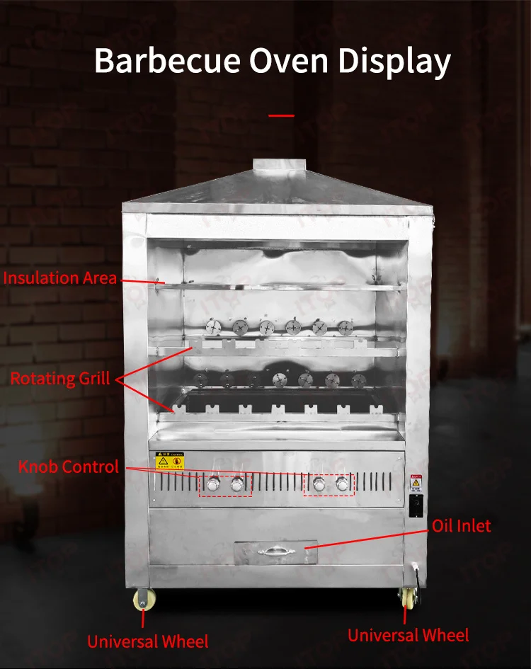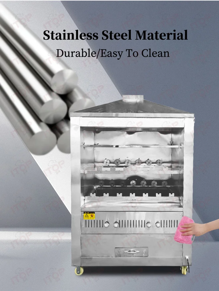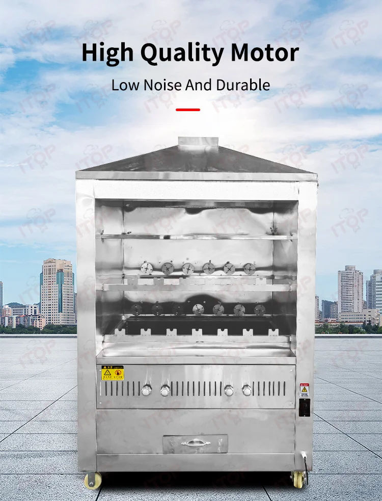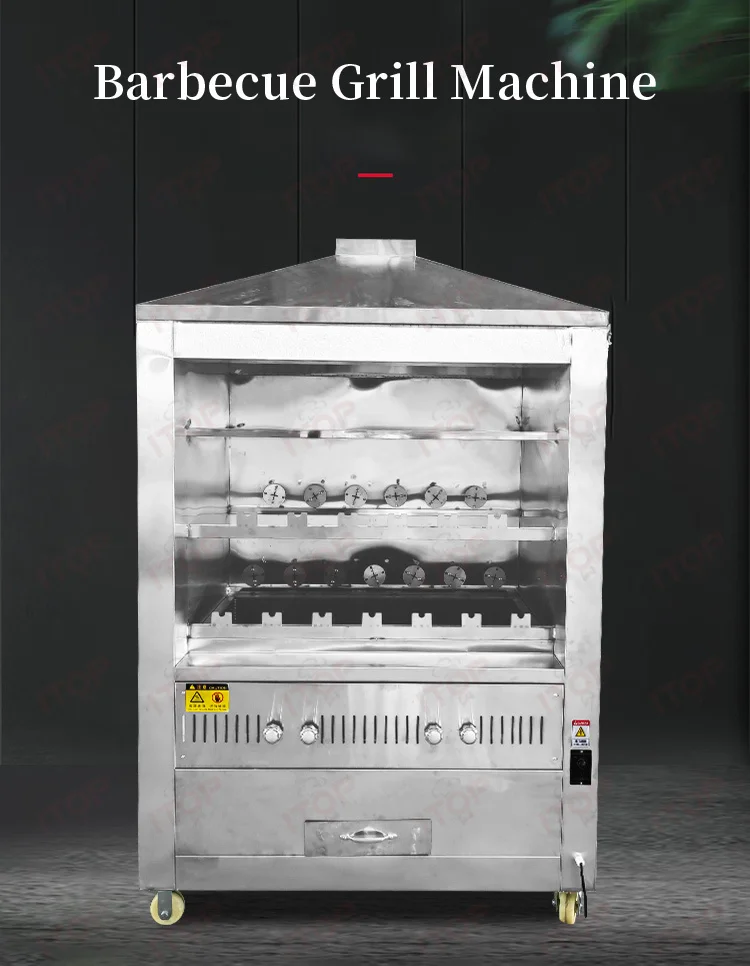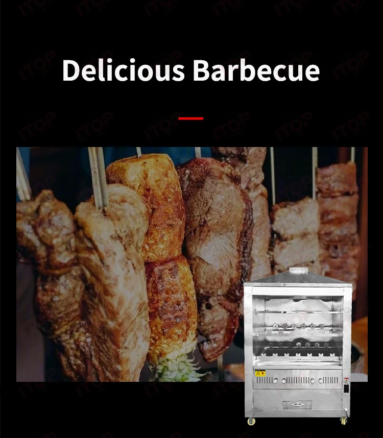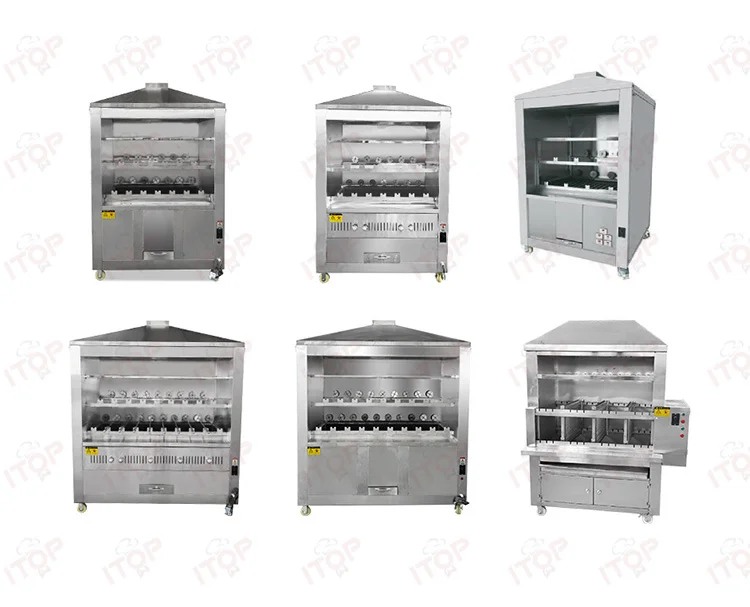 Features of brazilian churrasco machine 1. It takes small area, easy to operation. 2.The fuel can be charcoal or coke, it can keep the original flavor of churrascos. 3.The insider takes the fire resistance structure, the outsider is stainless steel, it looks clean and beautiful. 4.It's rotary automaticly, labor cost-efficient. 5.The ventilation installation can be adjusted, so you can control the machine temperature, and avoid the pollution for food. 6.Innovative swivelling unit is adjustable so you no longer have to cautiously move the kebab back and forth; 7.Simply push or pull to bring the burner closer to the meat with maximum ease and comfort ; 8.Inbuilt drip tray keeps machine clean and mess-free; 9.The new system also means the motor is inbuilt, eliminating motor exposure to heat which is the number one cause of motor failure; 10.Non slip feet to elevate the machine for air circulation of the motor and easy cleaning to increase hygiene;